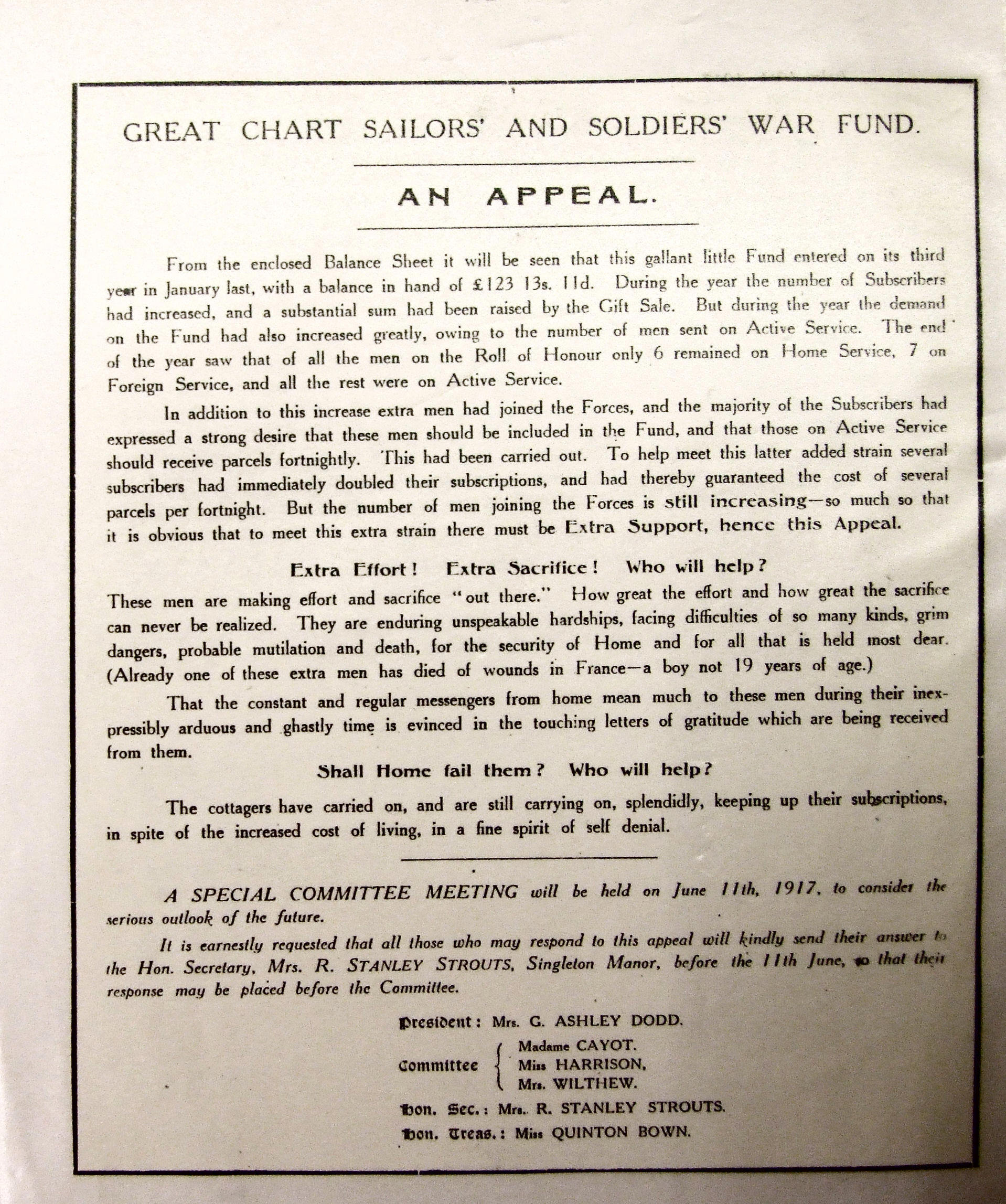 week. The balance sheet for 1915 shows that the receipts were £141 1s. 2d., the expenditure £118 0s. 11½ d., leaving a balance in hand of £23 0s. 2½ d. 830 parcels were dispatched to the men, and 186 letters were sent to them and 305 letters were received from them, in addition to numerous field post cards. This splendid work is still being continued in 1916. ------------------------------------------------------------------------------------------------------------------------------------ The Committee worked tirelessly throughout the Great War to raise money and collect donations to send to the "Boys of Chart". Here is a copy of one of their appeal posters: |