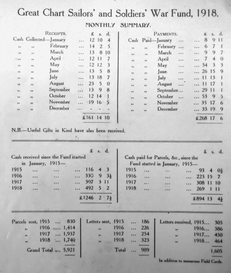 It seems likely that the idea grew out of the Christmas Comforts Tin sent to all serving troops by Princess Mary in Christmas 1914. Through the sterling work of Mrs Strouts and her Committee, the Friends of Great Chart sent a total of 5,921 parcels, 989 letters and received back 1,605 letters and numerous "Field Cards". ----------------------------------------------------------------------------------------------------------------------- GREAT CHART SOLDIERS’ AND SAILORS’ WAR FUND REPORT FOR YEAR 1915